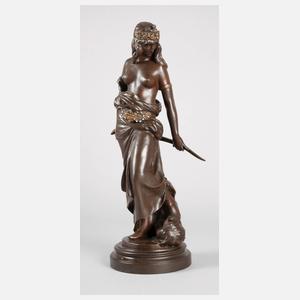 Ende 19. Jh., signiert, Gießerplakette E. Blot Paris, Metallguss dunkelbraun patiniert, partiell vergoldet und hellblau akzentuiert, Darstellung der halbnackten Judith in wallendem, um die Hüften geschlungenem Gewand, hinter dem Rücken hält sie das Schwert, mit dem sie das Haupt des Holofernes abgetrennt hat, welches zu ihren Füßen liegt, Patina erneuert, H ca. 39 cm.