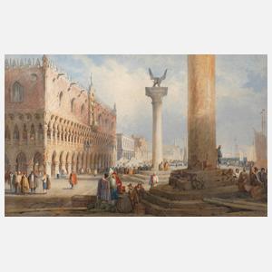geschäftiges Treiben auf San Marco mit den Säulen von San Marco und San Teodoro, im linken Bildbereich die prachtvolle Fassade des Dogenpalastes, Aquarell, Mitte 19. Jh., rechts unten signiert „Prout“, auf Rahmenrückseite Klebeetikett „The Fine Art Society“, und hierauf bezeichnet „Doge´s Palace looking towards the Riva degli … Venice“, „Samuel Proust“, unter Passepartout und hinter Glas gerahmt, Passepartoutausschnitt ca. 26,5 x 42 cm. Künstlerinfo: engl. Maler, Zeichner und Lithograph (1783 Plymouth/Devon bis 1852 London-Camberwell), Kindheit in Plymouth in der Grafschaft Devonshire, ab 1803 in London, bereiste mehrfach Europa und fertigte zahlreiche Veduten, vor allem Motive aus historischen Städten in England, Deutschland, Italien, Frankreich, der Schweiz und den Niederlanden, 1829 Ernennung zum königlichen Aquarellmaler durch George IV., tätig in London, Quelle: Thieme-Becker, Wikipedia und Internet.