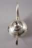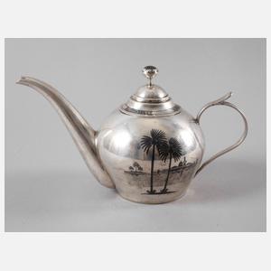 20. Jh., ungemarkt, Silber geprüft, Teekanne mit kugeligem Korpus und langer schlanker Schnaupe, in Niello-Optik verzierte Wandung mit orientalischer Stadtansicht, H 15 cm.