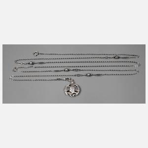 um 1910, Silber gestempelt 800, runder Anhänger mit Frauenkopf vor stilisiertem Meer, D 26 mm, an ca. 1,5 m langer Silberkette, leichte Tragespuren, G gesamt ca. 34,8 g.