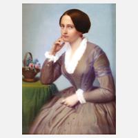 um 1900, ungemarkt, unsigniert, flache Porzellanplatte mit feiner Aufglasurbemalung, junge Frau in weitem Kleid, an einem Tisch mit Blütenkörbchen sitzend, in gekehlter, schwarz lackierter Leiste gerahmt, L Platte 14 cm, Maße gesamt 22 x 19,5 cm.