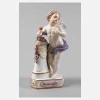aus einer Serie von 16 Devisenkindern, Entwurf Michael Victor Acier 1775, unterglasurblaue Schwertermarke Schmierzeit 1815–1860, einmal gestrichen, geritzte Modellnummer F8, Prägenummer 5, rote Pinselnummer 17., naturalistische Ausformung und feine polychrome Unterglasurbemalung sowie Goldstaffage, auf Dreiecksockel mit Rosettenecken und Bezeichnung stehende Amorette mit Herz in der Hand, zwei weitere Herzen auf der blütenverzierten Säule neben ihr liegend, minimal brandfleckig und fachmännisch restauriert, H 14 cm. Quelle: Bergmann, Meissener Figuren, Band II, S. 100, Abb. 191.