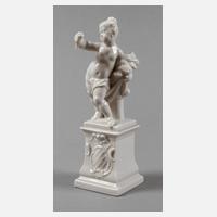 aus einer Serie von vier Kindergruppen, Entwurf Johann Carl Schönheit 1785, unterglasurblaue Schwertermarke 1934–1953, 1. Wahl, geritzte Modellnummer H90, Prägenummer 115, rote Pinselnummer 40., naturalistische Ausformung und feine polychrome Aufglasurbemalung sowie Goldstaffage, über Ovalsockel mit umlaufendem Ornamentband zwei Putten, auf Felsstütze sitzend bzw. lehnend, in den Händen eine Blütengirlande haltend und von einem Papagei oder Lamm flankiert, minimal brandfleckig, Blattwerk, ein Arm und Lammohr restauriert, H 15,5 cm. Quelle: Bergmann, Meissener Figuren, Band II, S. 109, Abb. 211.