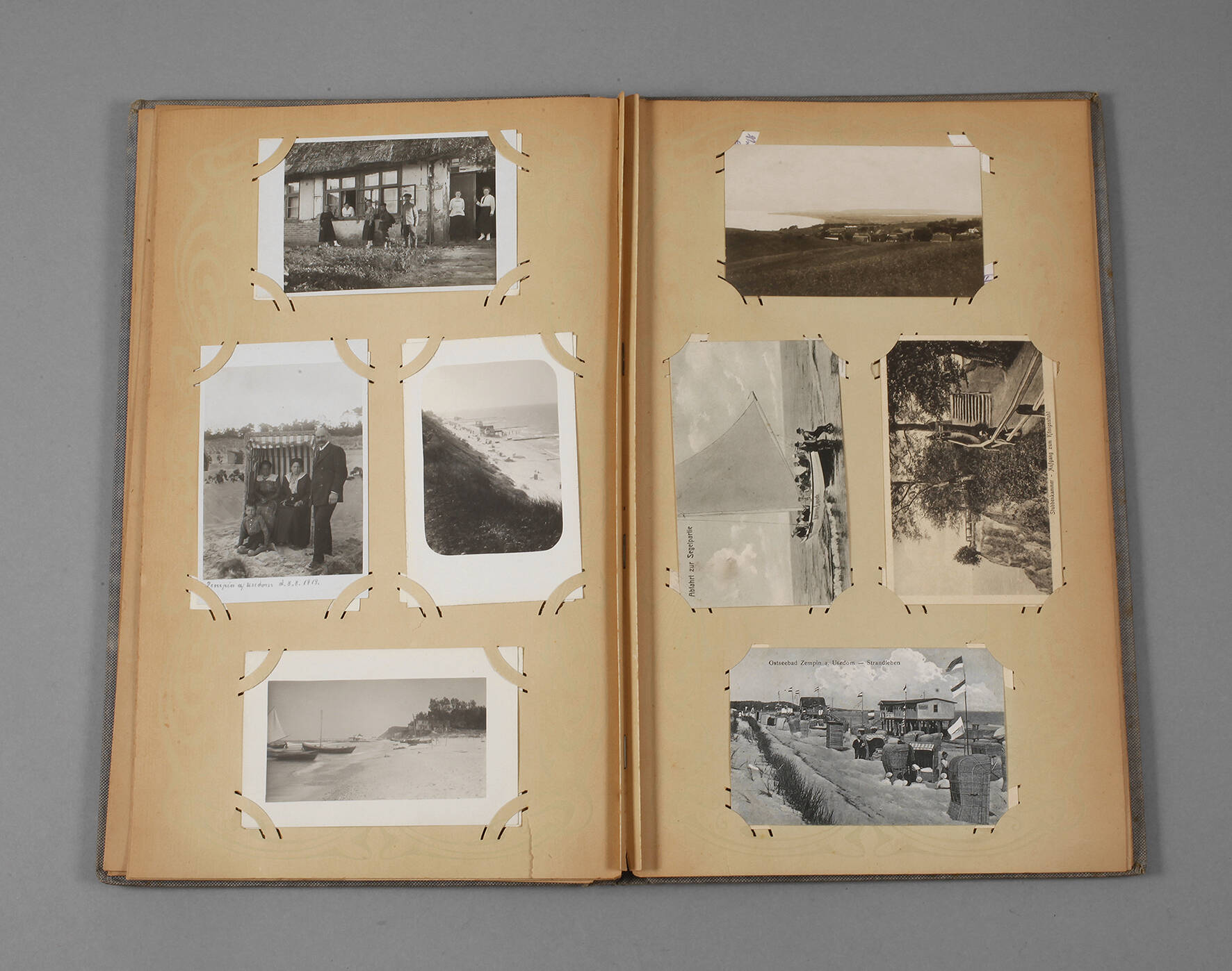 vor 1945, ca. 120 meist topographische Postkarten, dabei auch Kunstgeschichte, wenige farbig lithographierte, u.a. Brunshaupten Strandpartie mit Damenbad, in Jugendstilalbum, Altersspuren, Maße Album ca. 41 x 26 cm.