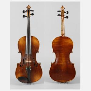 um 1920, ohne Zettel, Schnecke mit Brandstempel Concert Violin Straduari, geteilter, gleichmäßig geflammter Boden in bernsteinfarbenem Lack, umlaufende dreiteilige Randeinlage, Decke mit Rissbildung, stärkere Gebrauchsspuren, mit zwei gut erhaltenen Bögen, einer gemarkt Knoll, im Etui, L 35,9 cm.