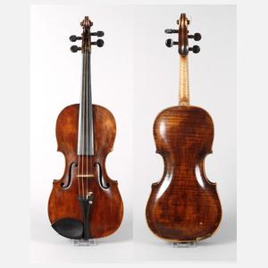 mit Klebezettel Leopold Johann? Nürnberg fecit anno 1783, geteilter, gleichmäßig geflammter Boden in haselnussbraunem Lack, dreiteilige umlaufende Randeinlage, die stark gewölbte Decke mit Rissbildung, beigegebener, defekter Bogen gemarkt Corona, im Etui, L Korpus 35,4 cm.