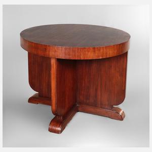 deutsch 1930er Jahre, in indischem Palisander furniert, runde Platte auf kreuzförmigem Gestell, profilierte Kanten mit abgerundeten Ecken, guter Zustand, H 75 cm, D 100 cm..