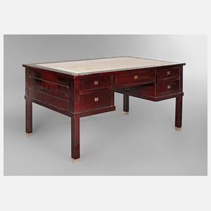 mahagonifurniert, sehr tiefer, frei im Raum stellbarer Schreibtisch, allseitig kassettiert, auf Vierkantfüßen mit verchromten Messingmanschetten, schlichte verchromte Beschläge, restauriert, Lederbespannung der Schreibplatte fehlt, etwas rest.bed., Maße 80 x 162 x 99 cm.