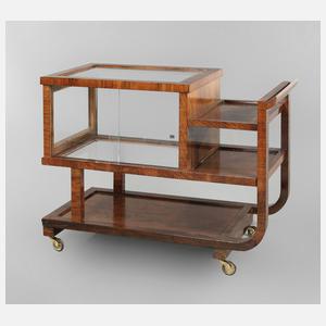 um 1930, Nussbaummaser furniert, Glasplatten teilweise mit Facettschliff, beidseitig mittels Schiebetür zum Öffnen, auf gummibereiften Messingrädern, Maße 65 x 88 x 41 cm.