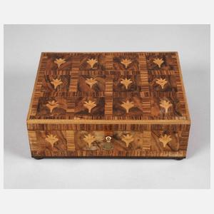 um 1920, flacher rechteckiger Korpus in Nussbaumwurzel, Zebrano und Ahorn furniert, die Wandung umlaufend von geometrischen Feldern mit rapportierendem Blütendekor verziert, innen mahagonifurniert sowie teils mit blauem Samt ausgekleidet, mit Schlüssel, leichte Altersspuren, Maße 9 x 26 x 20 cm.