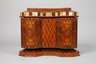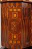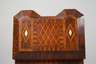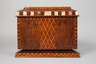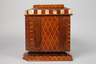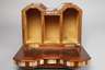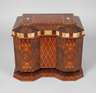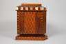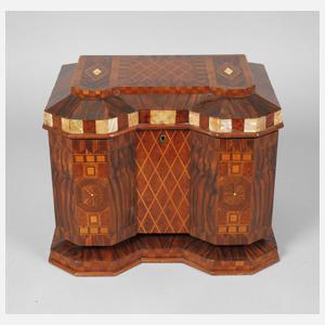 um 1920, handschriftlicher Besitzername G. Cristal, polygonal facettierter Korpus, überaus aufwendig in Nussbaumwurzel und-maser, Vogelaugenahorn, Birke, Mahagoni und Perlmutt intarsiert, die Front mit Eckrisaliten, die Wandung umlaufend von Gitterwerk und Schachbrettmustern verziert, der schwere scharnierte Deckel dieser in korrespondierendem Dekor sowie eingelegten Rauten, Messingmontierungen, dreigeteiltes Innenleben, originaler Schlüssel, Altersspuren und minimalste Furnierverluste, Maße 29 x 26 x 35 cm.