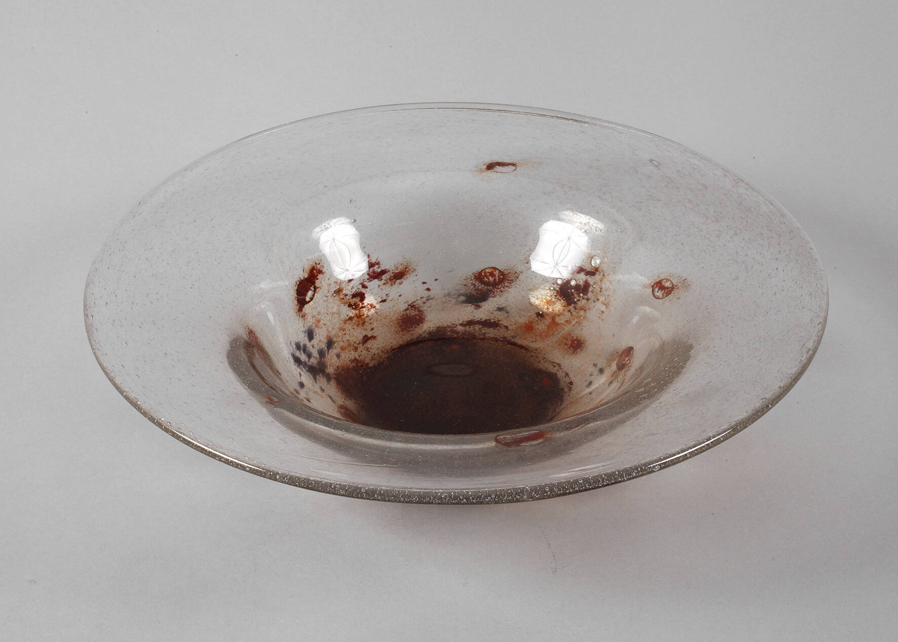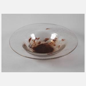 1930er Jahre, farbloses Glas, plangeschliffener Stand, eingeschmolzene Blasen und unregelmäßige Farbschichten in Rotbraun und Grau, guter Zustand, D 32 cm.