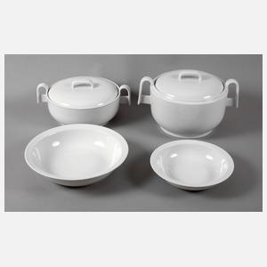 Entwurf Arthur Hennig 1930, Modellnummer 475, grüne Stempelmarken "Kaestner Saxonia" sowie teils mit Schriftzug "Modell Prof. Henning", zwei Deckelterrinen sowie zwei Schüsseln verschiedener Größe, altersgemäß gute unbeschädigte Erhaltung, H max. 18 cm.