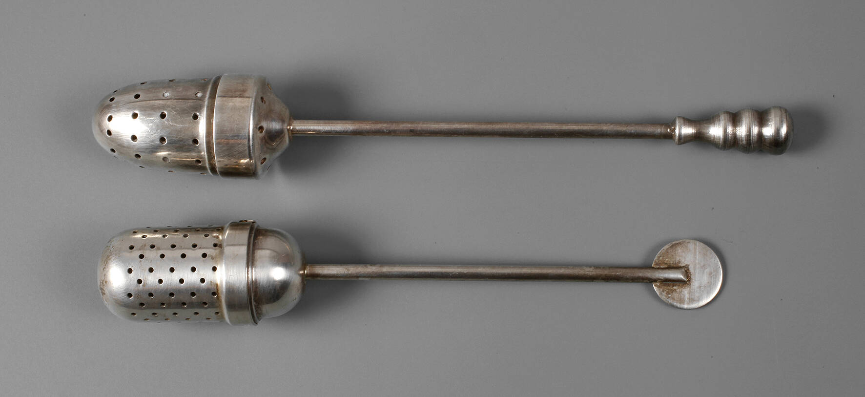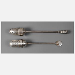 Entwurf 1924, Messing versilbert, Tee-Ei mit zylindrischem, durchlöchertem Korpus, gewölbtem eingepassten Schraubdeckel und stabförmigem Schaft, Griff in Form einer kleinen Scheibe, das andere zapfenförmig mit Kugelabschlüssen, dieses gestempelt "Qualität Schwerte DVNS", beide mit normalen Gebrauchs- und Altersspuren, L 13,5 und 15,5 cm. Quelle: Die Metallwerkstatt am Bauhaus, Ausst.-Kat. Bauhaus Archiv, Berlin 1992, Abb. S. 194, Nr. 142.