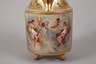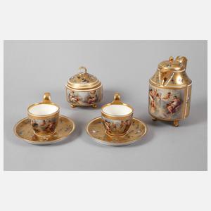 um 1900, blaue Bienenkorbmarke, verschiedene gestempelte Nummern, reiche Vergoldung und polychrome Bemalung, Kanne mit Zuckerdose und zwei Tassen mit Untertassen, ausgemalte Szenen mit jungen Frauen und Engeln in Himmelslandschaft, Deckel der Zuckerdose und Henkel stärker restauriert, H Kanne 17 cm.
