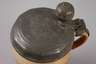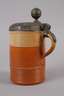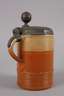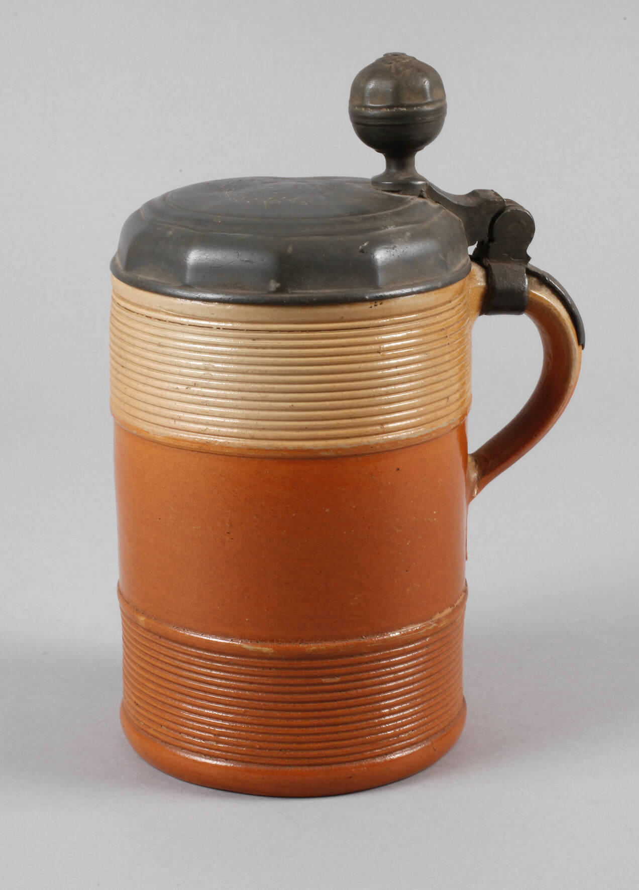 um 1750, helles Steinzeug mit bräunlicher und honigfarbener Salzglasur, Zylinderform mit Rillendekor, kurzer Henkel, übergreifender Zinndeckel mit großem Kugeldrücker, aus Adelsbesitz, mit bekröntem Besitzermonogramm ADH 1755 im offenen Blattkranz, gepunzt Johann Weigang Bautzen, Meister ab 1729, Henkelansatz minimal brandrissig, zwei winzige Fehlstellen am Lippenrand, insgesamt sehr gute altersgemäße Erhaltung, H 23 cm.