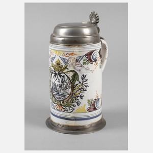 18. Jh., auf weißer Glasur bunte Scharffeuermalerei, zwei schwebende Engel über einer bekrönten Kartusche mit chinesischer Landschaft, beidseitig Blütenbordüren, durchgebödeter Zinnstand, Lippenrand mit übergreifendem Deckel und Muschelrast, alt übermalte Haarrisse, identisches Stück im Angermuseum Erfurt, H 23,5 cm.