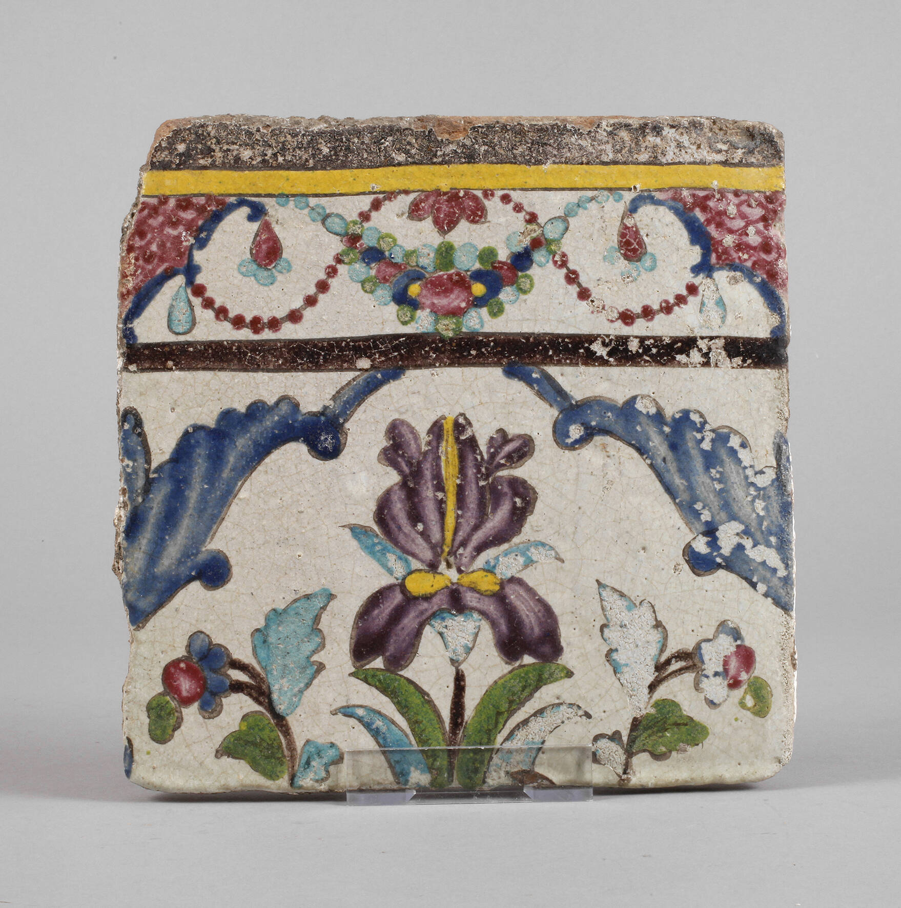 17./18. Jh., rötlicher Scherben mit weißlicher Craqueléglasur und floralem Pinseldekor, Farbabplatzer und kleine Fehlstellen an den Kanten, Wandaufhängung, Maße 20,5 x 21 cm.