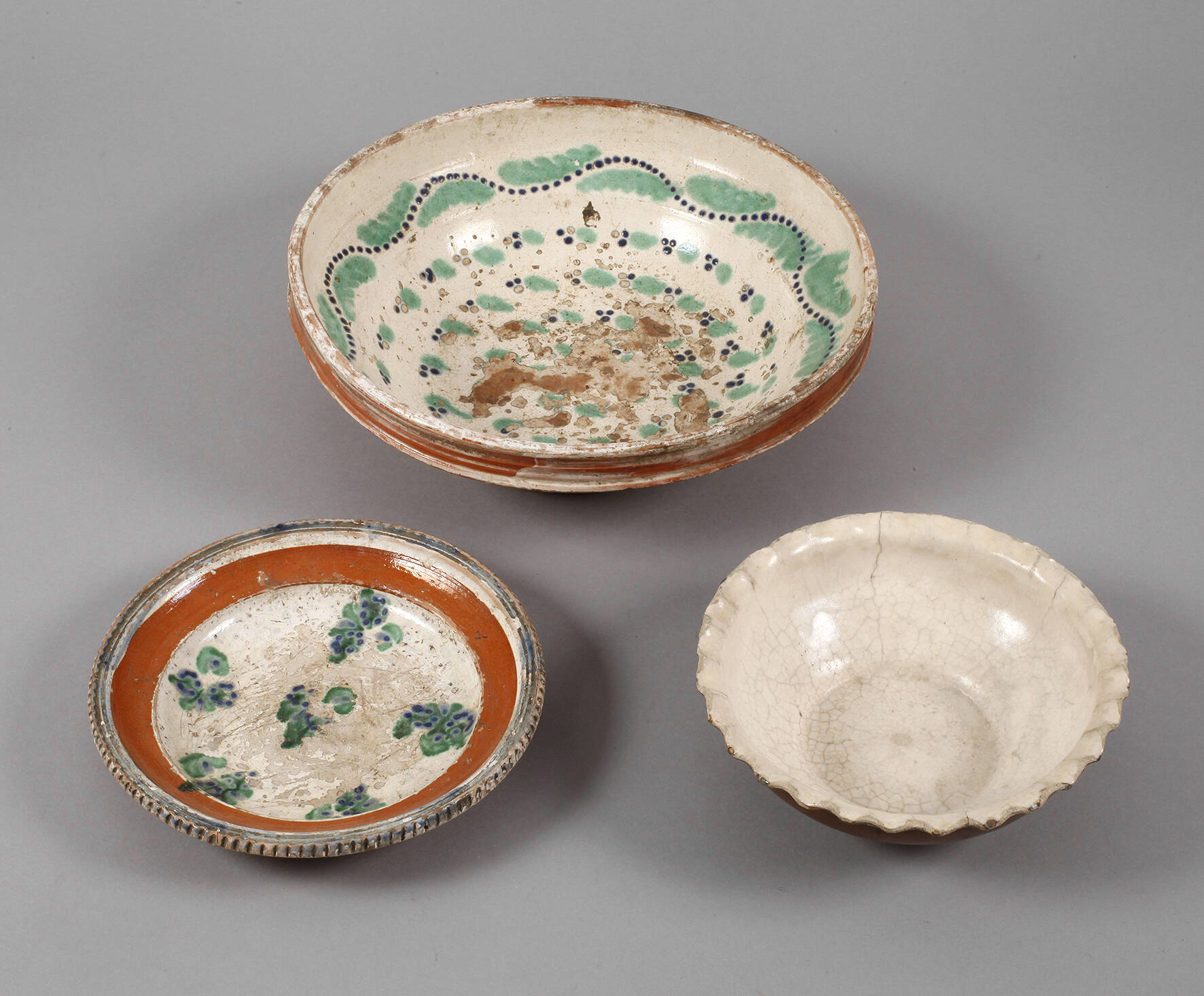 19. Jh., Hafnerware mit getupftem Pinseldekor in Türkis und Blau auf cremefarbenem Fond, eine Schale nur glasiert und ohne Bemalung, stärkere Gebrauchs- und Altersspuren, D 20 und 32 cm.