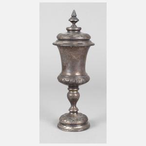 datiert 1890, Silber geprüft, innen vergoldet, in floral gerahmter Katusche Widmung: "Herrn Karl Schneider zum 50jährigen Berufsjubiläum, gewidmet von seinen Collegen", stärker angelaufen und reinigungsbedürftig, Fuß beschwert und etwas gedellt, H 25 cm.