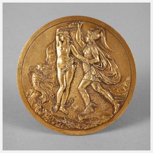wohl Anfang 19. Jh., unsigniert, verso gestempelt "4 1/4" sowie "749", Bronze vergoldet, reliefierte Darstellung der von Poseidon an den Felsen geketteten Andromeda, Perseus, in den Flügelschuhen des Merkur, zu ihrer Rettung eilend, auf runder, naturalistisch gestalteter Medaille, im Hintergrund das in der den Felsen umspülenden Gischt lauernde Seeungeheuer mit Fischschwanz angedeutet, gute Erhaltung mit kleinen Altersspuren, rückseitig schraubbare Befestigung, D ca. 11 cm.