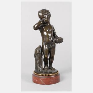 19. Jh., unsigniert, Bronze dunkel patiniert, Darstellung eines Putto mit weinlaubverziertem Körbchen, wohl mit Trauben, auf runder, von einem Perlband umschlungener Plinthe, auf Marmorsockel mit gekehlter Oberkante, gute Erhaltung, H Bronze ca. 20,5 cm, H gesamt ca. 23 cm.