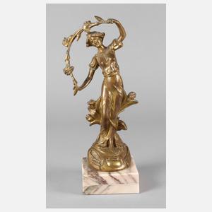 um 1900, unsigniert, Metallguss golden patiniert, Darstellung einer Jugendstilschönheit in wallendem Kleid mit Blumengirlande, auf vegetabil und ornamental verzierter Plinthe, auf Marmorsockel, dieser ergänzt, Girlande und ein Arm geklebt, H Skulptur ca. 31 cm, H gesamt ca. 35 cm.