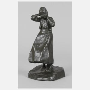 1. Hälfte 20. Jh., signiert, Keramik dunkelgrün patiniert, minimal abstrahierte Darstellung einer jungen Frau in typischer holländischer Tracht, sich in starkem Wind die Haube haltend, auf naturalistisch gestalteter Plinthe, sehr gut erhalten, H ca. 24 cm. Künstlerinfo: schwedische Bildhauerin (1873-1941), geboren auf Örby Manor in Vallentuna bei Stockholm, Schwester des Bildhauers Carl Milles (1875-1955) studierte 1892-93 an der Tekniska Skolan (Technischen Schule, Vorgängerin der Konstfack University College of Kunsthandwerk und Design in Stockholm), danach 1894-98 an der Royal Swedish Academy of Arts, besuchte die Theosophische Gesellschaft, die ihr späteres Leben und Schaffen beeinflusste, Abreise nach Paris und Studium an der Académie Colarossi und École des Beaux-Arts, bereiste Frankreich und Deutschland, 1903 Rückkehr nach Schweden und in Islinge auf Lidingö niedergelassen, dort teilte sie sich zeitweise ein Studio mit der Frau ihres Bruders Carl, Olga Milles, stellte auf zahlreichen Ausstellungen aus und erhielt ebenfalls Preise für ihre Arbeiten, illustrierte einige Bücher, 1932 Umzug nach Rom, durch schwindende Gesundheit wandte sie sich dort zunächst der Malerei und später dem Schreiben zu, verstarb 1941 in Rom, wo sie auch beigesetzt wurde. Quelle: Internet.