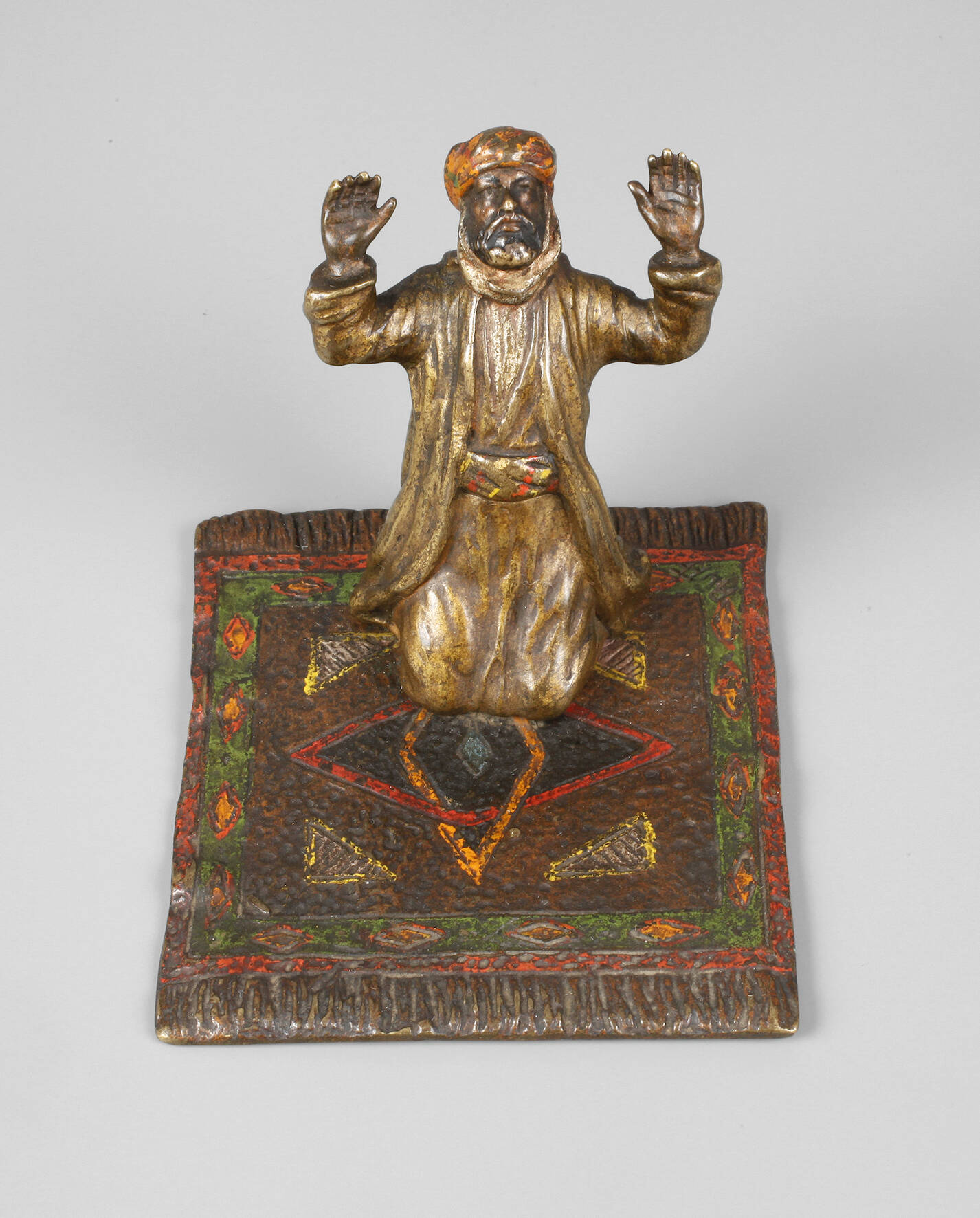 um 1900, unsigniert, Bronze polychrom in Kaltbemalung staffiert, Darstellung eines Orientalen in typischer Tracht mit Turban, in kniender Haltung mit erhobenen Händen, teils stärkere Altersspuren und Farbverluste, H ca. 7,5 cm.
