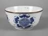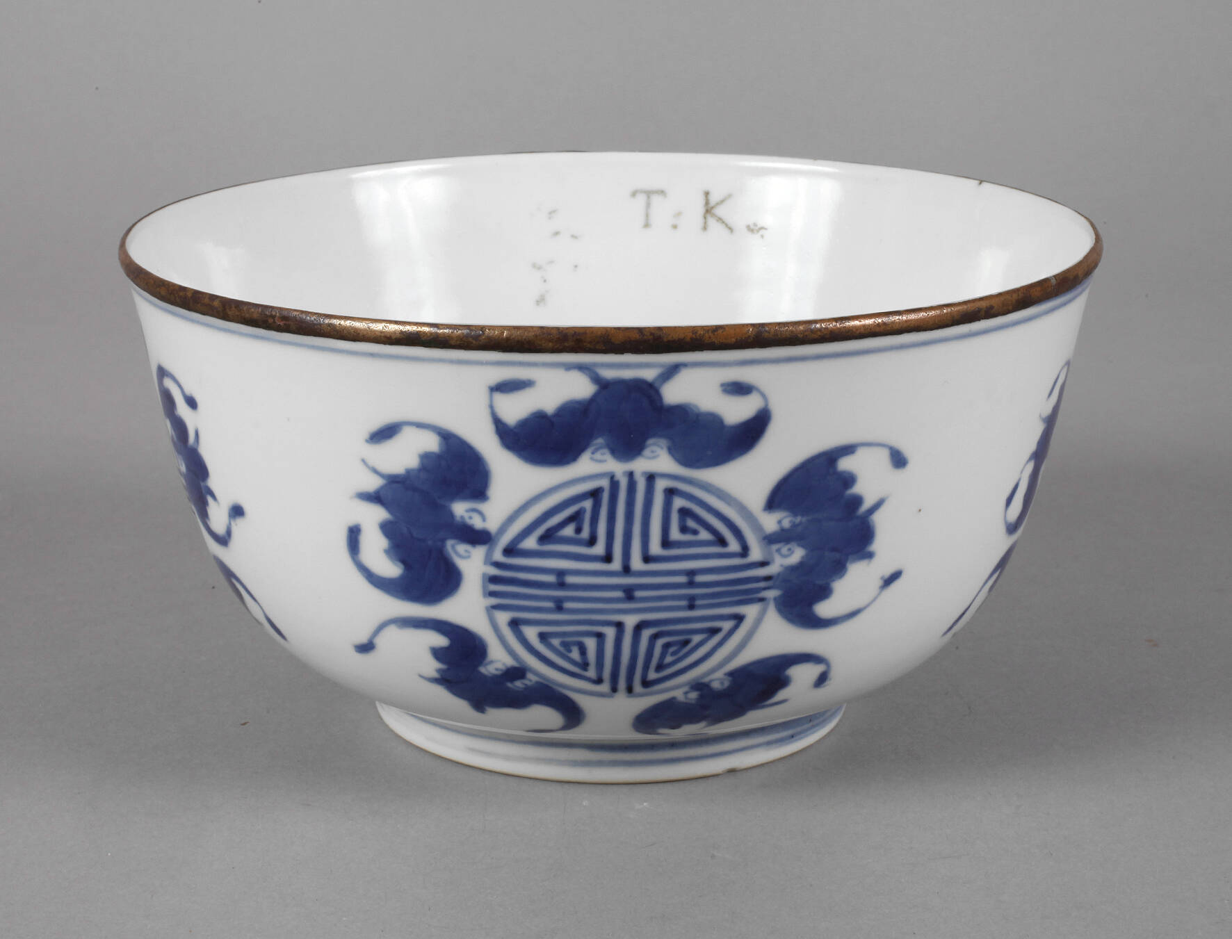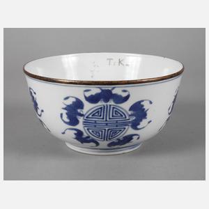 wohl 19. Jh., für den vietnamesischen Markt, am Boden Vier-Zeichen-Marke, Porzellan in kobaltblauer Unterglasurbemalung, am Rand mit schmaler Kupfermontierung, Wandung umlaufend dekoriert mit stilisierten Shou-Motiven und Fledermausdarstellungen, Wandung innen mit geritztem Monogramm TK, am Stand winz. best., D 17 cm.