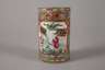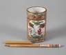 um 1920, ungemarkt, Porzellan in polychromer Aufglasurbemalung Famille rose und reicher Goldstaffage, zylindrischer Korpus, teils durchbrochen gearbeitet, die Wandung von figürlichen Darstellungen und floralen Elementen verziert, beigegeben Pinsel im Bambusgehäuse, Altersspuren, partiell berieben, H 11 cm.