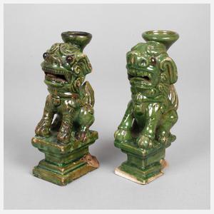 China, Ende 19. Jh., Feinsteinzeug grün glasiert, Öllämpchen in Form vollplastisch gearbeiteter Wächterlöwen mit aufgesetzten Tüllen, teils größere Fehlstellen, H je 16 cm.