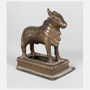 19. Jh., ungemarkt, Bronze dunkelbraun patiniert, vollplastische Darstellung des Reittieres Shivas, Altersspuren, L 12 cm.