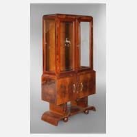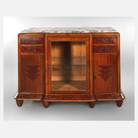 Frankreich um 1930, in Mahagoni und Nußbaum-Maser furniert, dreitüriger Korpus mit vorgebautem Mittelteil, dieses mit facettgeschliffener Glasscheibe, die seitlichen Türen mit intarsierten überlappenden Dreiecken, darüber je zwei kleine Schubladen, eingelassene Marmorplatte, Glaseinlegeböden, guter Zustand, mit originalen Schlüsseln, Maße 108 x 143 x 60 cm.