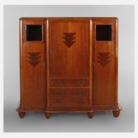 passend zu vorhergehender Posititon, Frankreich um 1930, in Mahagoni und Nußbaum-Maser furniert, dreitüriger Korpus mit vorgebautem Mittelteil, dieses mit drei Schubladen, die Türen mit drei überlappenden Dreiecken intarsiert, guter Zustand, mit Schlüssel, Maße 151 x 143 x 60 cm.