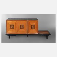 wohl Italien, 1930er Jahre, mahagonifurniert bzw. schwarz lackiert, frei im Raum stellbares Möbel, bestehend aus Sockel, einem zweitürigen und einem eintürigen Kasten sowie einer Abstellfläche mit eingelegten viereckigen Sprossen, von beiden Seiten zu bedienen, innen mit breitem Schubkasten, die Beschläge aus Schmiedeeisen, guter Zustand, Maße 63 x 195 x 45 cm.