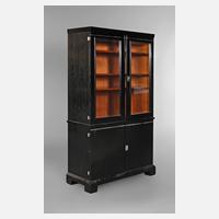 1920er Jahre, eichefurniert, schwarz gebeizt, innen komplett in Mahagoni furniert, Türen mit facettgeschliffenen Scheiben, drei an Zahnleisten verstellbare Einlegböden, vernickelte Beschläge und Zierbänder, Stangenschlösser, außenliegenden Scharniere, restauriert, das Schloss einer Tür verklemmt, Schlüssel ergänzt, Maße 170 x 102 x 44 cm.