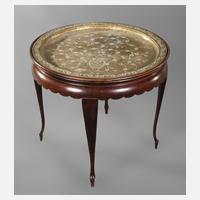wohl Wien 1920er Jahre, rundes Gestell aus massiver Birke, dunkelbraun gebeizt, eingelegte Platte aus Messingblech, fein getriebenes stilisiertes Floraldekor, guter Originalzustand, H 58 cm, D 67 cm.
