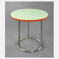 wohl Frankreich, 1930er Jahre, Stahlrohr verchromt, runde Platte aus Schichtholz, darüber grün gefärbte Glasplatte, Chrom Z 2-, zwei Klemmen für die Glasplatte fehlen, H 46 cm, D 53 cm.
