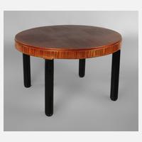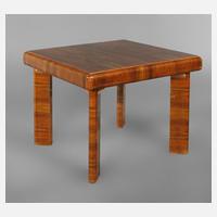 deutsch, um 1930, in kaukasischem Nussbaum furniert, die Zarge leicht abgerundet, diagonal gestellte, breite Pfostenfüße, Oberfläche rest.bed., Maße 72 x 90 x 90 cm.
