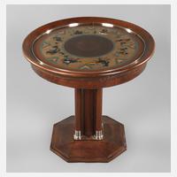 um 1925, Eiche massiv und furniert, braun gebeizt, Säulen mit verchromten Manschetten, große runde Platte aus klarem Glas, mit fein gemalten Darstellungen von Rauchern verschiedener Nationen in Hinterglasmalerei, restauriert, H 56 cm, D 70 cm.
