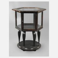 deutsch, 1920er Jahre, Eiche massiv und furniert, schwarz gebeizt, sechseckiger Tisch mit facettgeschliffenen Scheiben und zwei gegenüberliegenden Türen, Alters- und Gebrauchsspuren, Maße 73 x 53 x 53 cm.