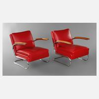 Modell S 411,1930er Jahre Stahlrohr verchromt, freischwingende Sessel mit Armauflagen aus Buchenholz, roter Lederbezug in bester Qualität erneuert, Chrom Z 1-2, Maße 72 x 76 x 64 cm.