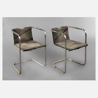 wohl 1930er Jahre, Freischwinger aus verchromtem Stahlrohr, schwarzer Stoffbezug mit eingenähten Holzplatten, starke Alters- und Gebrauchsspuren, Chrom Z 3-, H 68 cm, SH 45 cm.