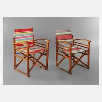 um 1930, klappbares Gestell aus massiver Buche mit drehbar gelagerter Lehne, originale Sitzbezüge mit Streifendekor, funktionstüchtig, Altersspuren, Maße 90 x 61 x 56 cm.