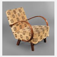 wohl Tschechien 1930er Jahre, Sitzmaschine mit verstellbarer Rückenlehne, Gestell aus massiver Buche braun gebeizt, originales Stoffpolster, guter Zustand, Maße 78 x 92 x 67 cm.