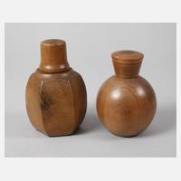 deutsch um 1925, ungemarkt, Nussbaum massiv, eine mit kugeligem Korpus und Stopfen, die andere mit facettiertem Korpus und Deckel in Becherform, min. Altersspuren, H 14 und 15 cm.