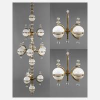 1940er Jahre, auf den Wandappliken signiert, Messing zaponiert, Kristallglas geschliffen, die kugelförmigen Schirme aus von innen mattiertem Klarglas, zwölfflammig elektrifiziert, dazu zwei zweiflammige Wandappliken sowie eine 1,2 Meter lange Verlängerungsstange des Lüsters mit Baldachin, eine Kristallkugel lose, Kristallbehang sonst vollständig und in sehr gutem Zustand, H 218 cm, Verlängerung 120 cm, D 70 cm, H Wandapplik 45 cm. Info: 1823 gründete Josef Lobmeyr (* 17. März 1792 in Grieskirchen; † 8. Mai 1855 in Wien) in Wien ein Handelshaus für Glaswaren, das in zweiter Generation unter seinen Kindern Josef, Ludwig, Louise und Mathilde unter der Firma „J. & L. Lobmeyr“ große Bekanntheit erlangte. 1855 übernahmen die Brüder Josef und Ludwig von ihrem Vater die Firmenleitung; Josef wurde kaufmännischer Direktor, während Ludwig für das künstlerische Programm verantwortlich zeichnete. In der Nachkriegszeit konnten Aufträge für die Luster und Leuchter in der Wiener Staatsoper, das Theater in Luxemburg, der Metropolitan Opera in New York, John F. Kennedy Center for the Performing Arts in Washington DC und den Kreml in Moskau die Geschäfte am laufen halten. Lobmeyr führte auch Aufträge aus für den saudischen Königshof und den Sultan von Brunei. Quelle Wikipedia.