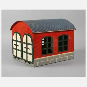 Modell 2112/1, Baujahr 1909-1932, ungemarkt, Blech farbig handlackiert, passend zu Spur 1, als zweiständige Halle mit imitierter Backsteinmauer, durchbrochen gearbeiteten Fenstern, Wellblechdach und zwei Flügeltüren, bespielter Zustand mit kleinen partiellen Farbabplatzern, H Einfahrt 18 cm, Maße max. 30 x 38 x 29 cm.