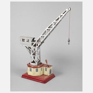 Nürnberger Blechspielwarenfabrik, um 1950, bezeichnet Made in Germany US-Zone, Blech farbig lithografiert, Uhrwerkantrieb intakt, große Ausführung mit auf Gebäude befindlichem Kran mit Führerhaus und Lastenhaken, Dreh- und Lastenbewegung mittels Hebel, funktionsfähig, normale Alters- und Gebrauchsspuren, Maße Bodenplatte 20 x15 cm, H 50 cm.